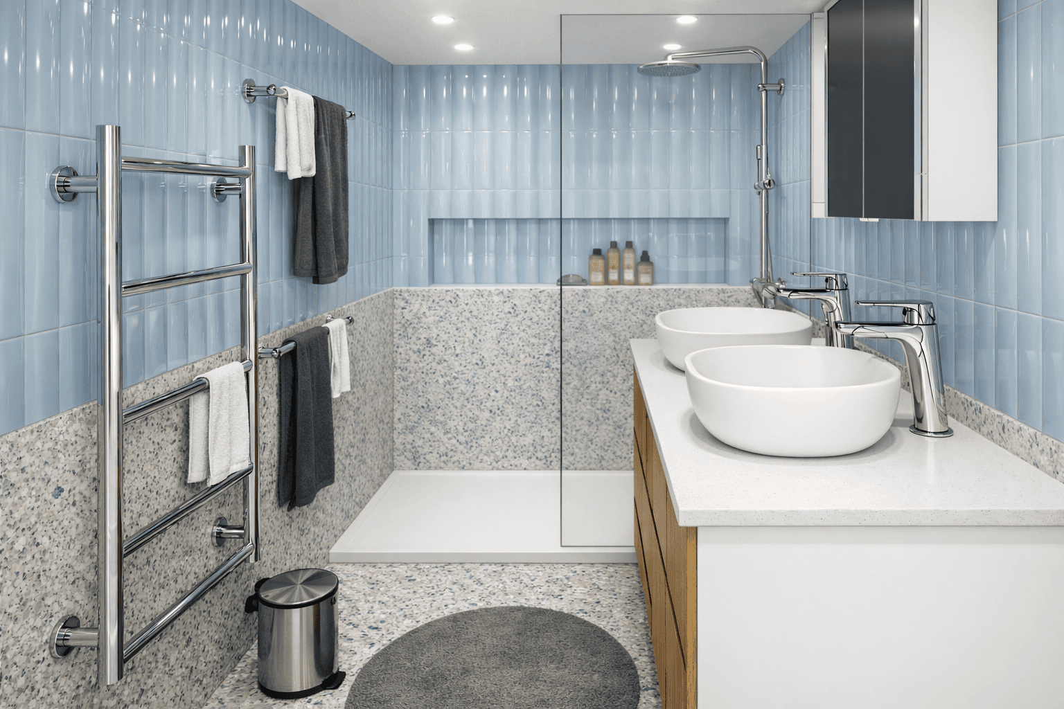 Aménagement d’une douche classique avec niche fonctionnelle et meuble suspendu à double vasque pour faciliter l’usage quotidien