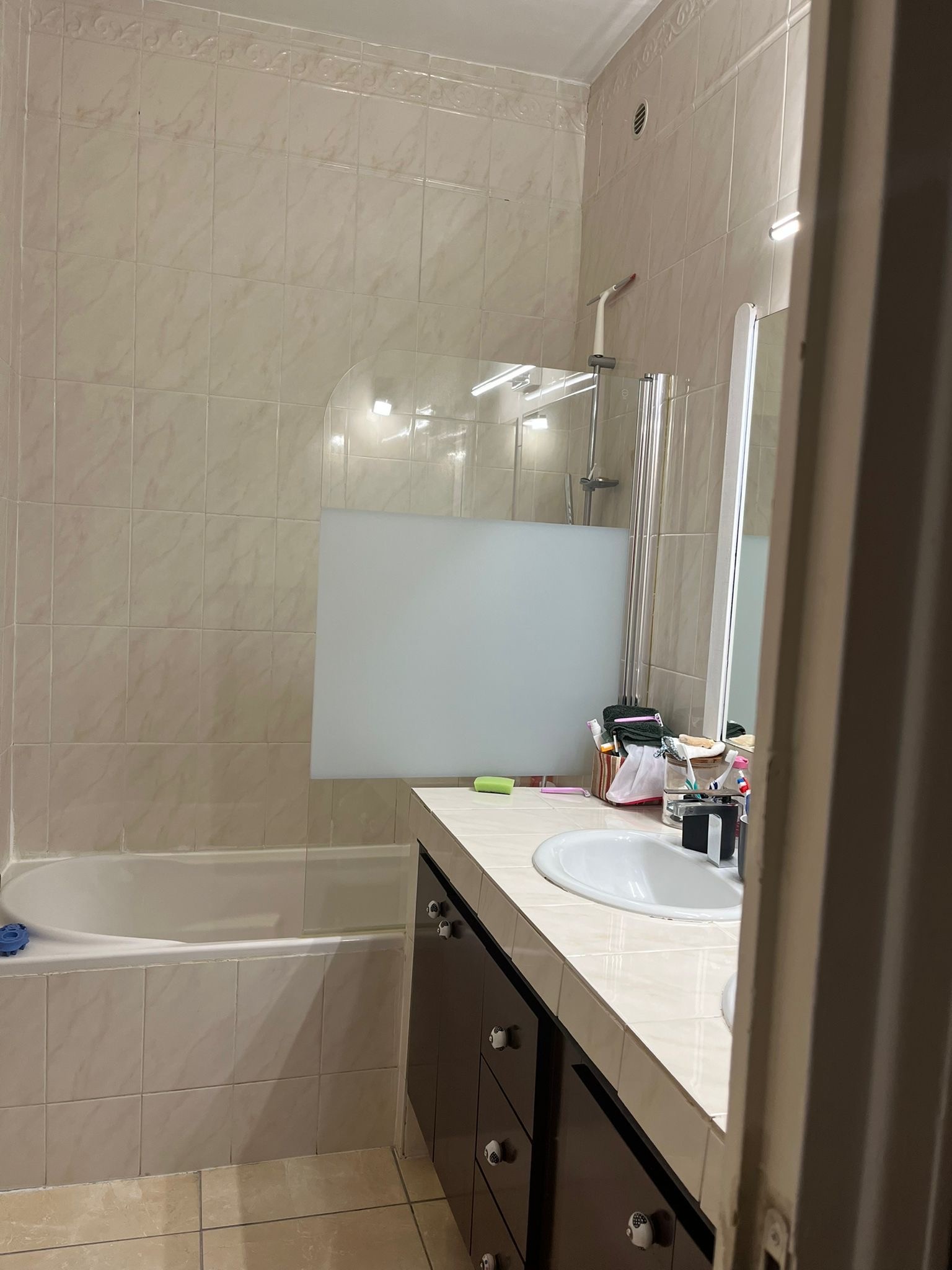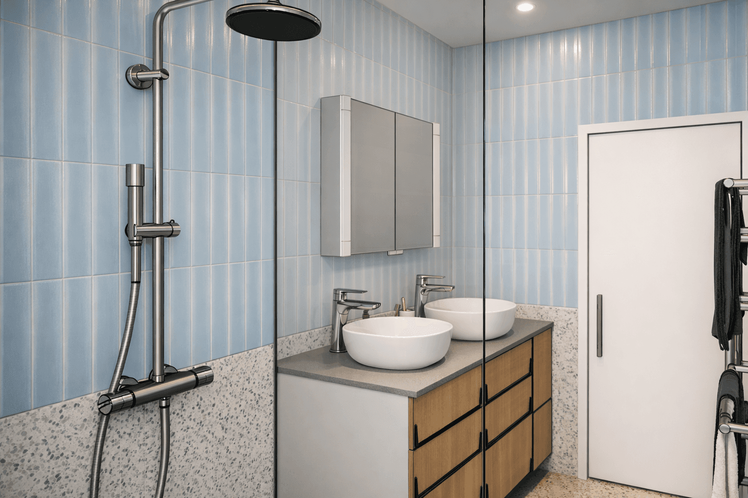 Les aménagements fonctionnels — meuble suspendu, douche optimisée, espaces dédiés — structurent l’ensemble tout en conservant élégance et sobriété.