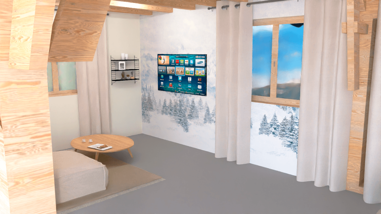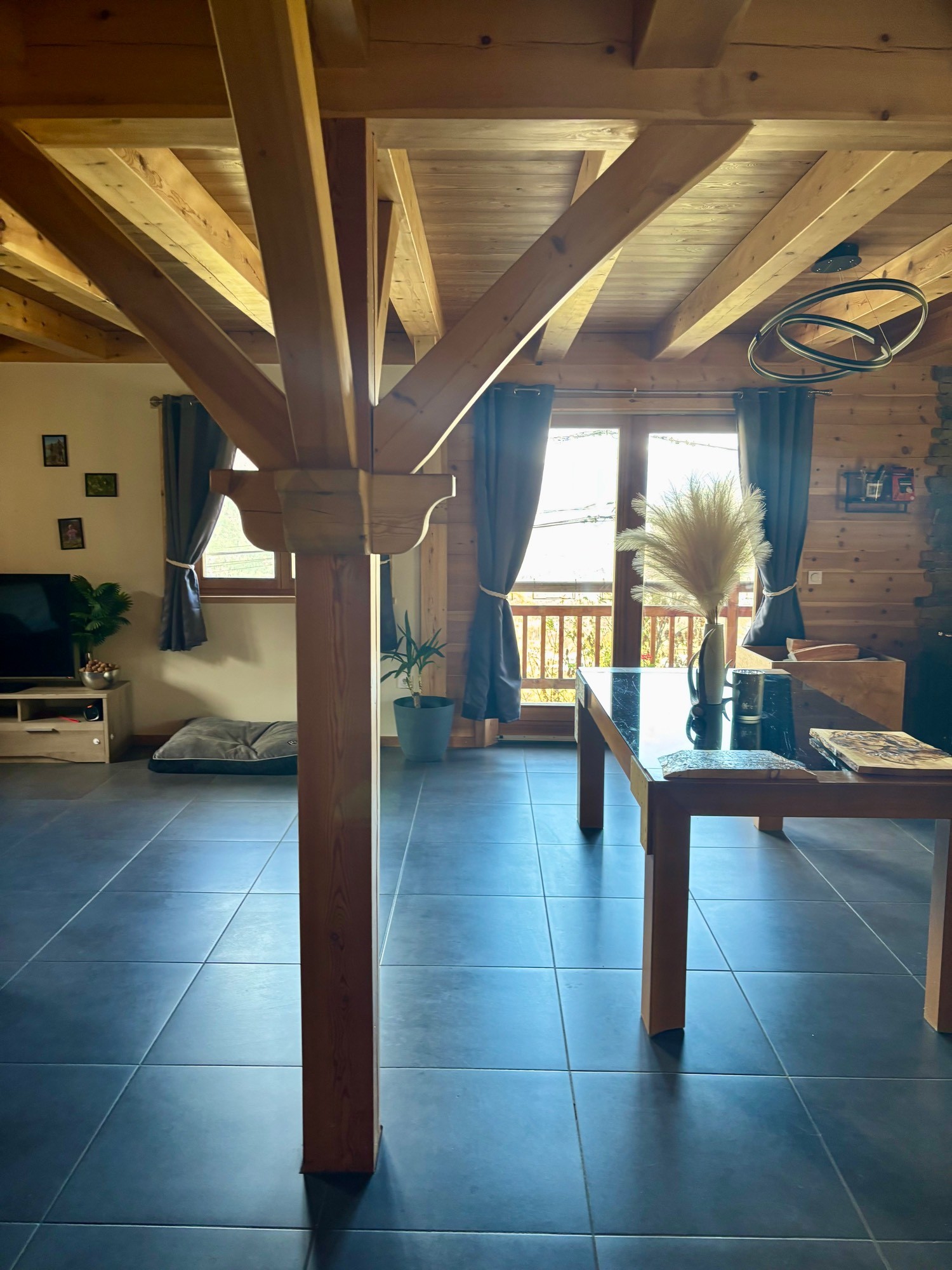 Le client souhaitait transformer ce salon, où le sol en carrelage noir et le bois donnaient une ambiance sombre, en un espace plus moderne et lumineux.